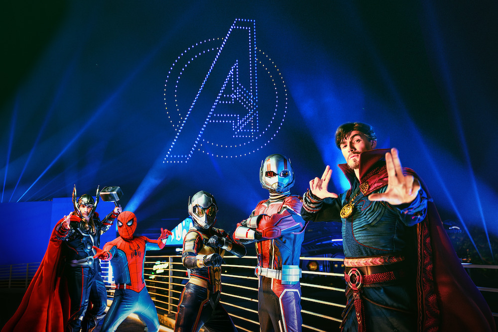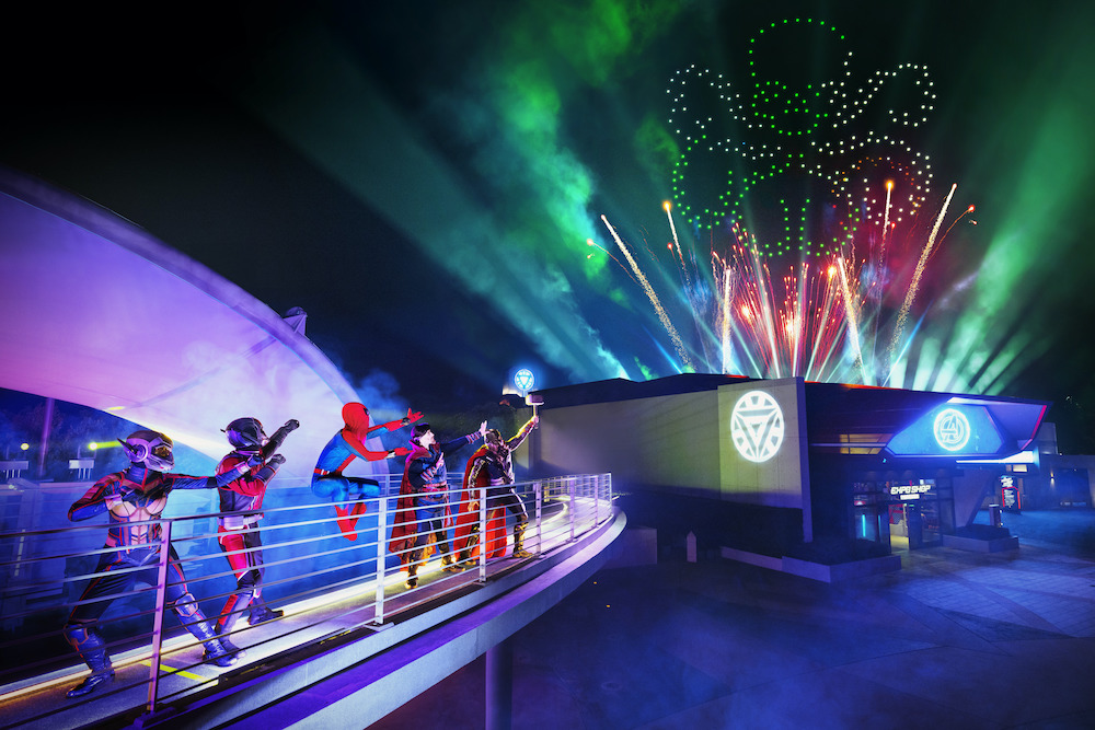 Things get even more explosive with the nighttime drone show, “Find Your Super Power: Battle in the Sky.” Drones with multicolored lights dance in the sky, forming icons of beloved Avengers as well as Dr. Arnim Zola, leader of HYDRA. Paired with LED screens and a climactic fireworks show, it’s a sight to behold that was enjoyed by the gathered families.