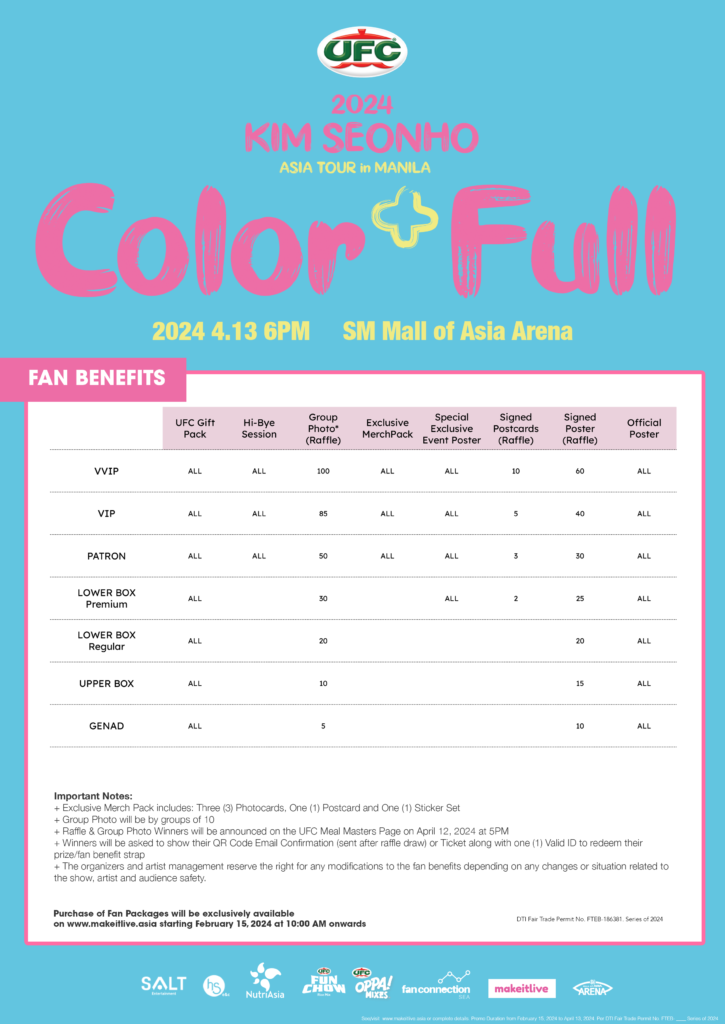 For “Color+Full” fanmeet, All the ticket holders will get a UFC Gift pack and official poster. All tiers will have a chance to bring home a signed poster and participate in the group photo through a raffle. The VVIP, VIP and Patron section will participate in the Hi-Bye session and receive an exclusive merch pack, exclusive event poster and automatically qualify to signed postcard raffle.. The Lower box section will also receive an exclusive event poster and participate in the signed postcard raffle.